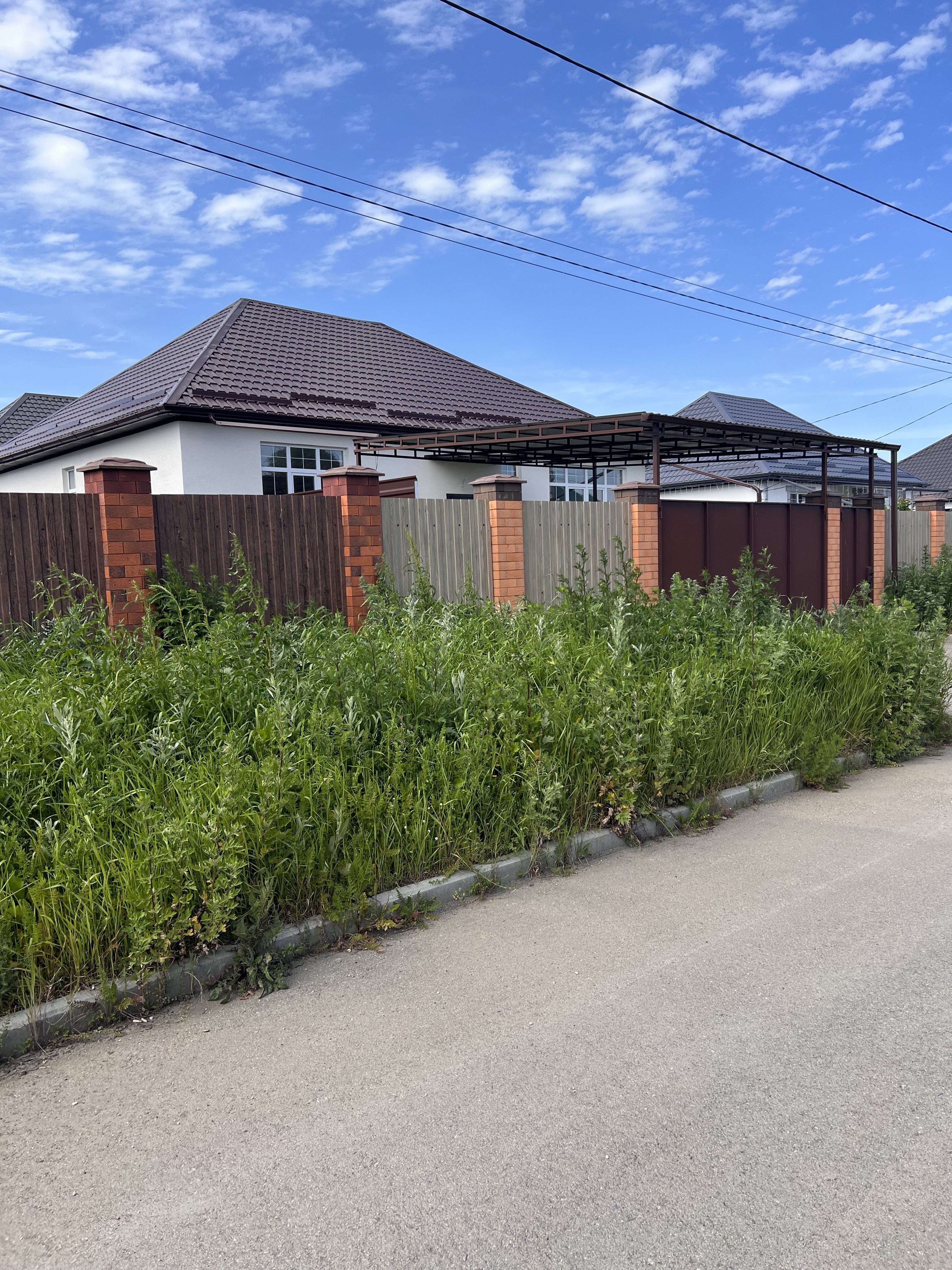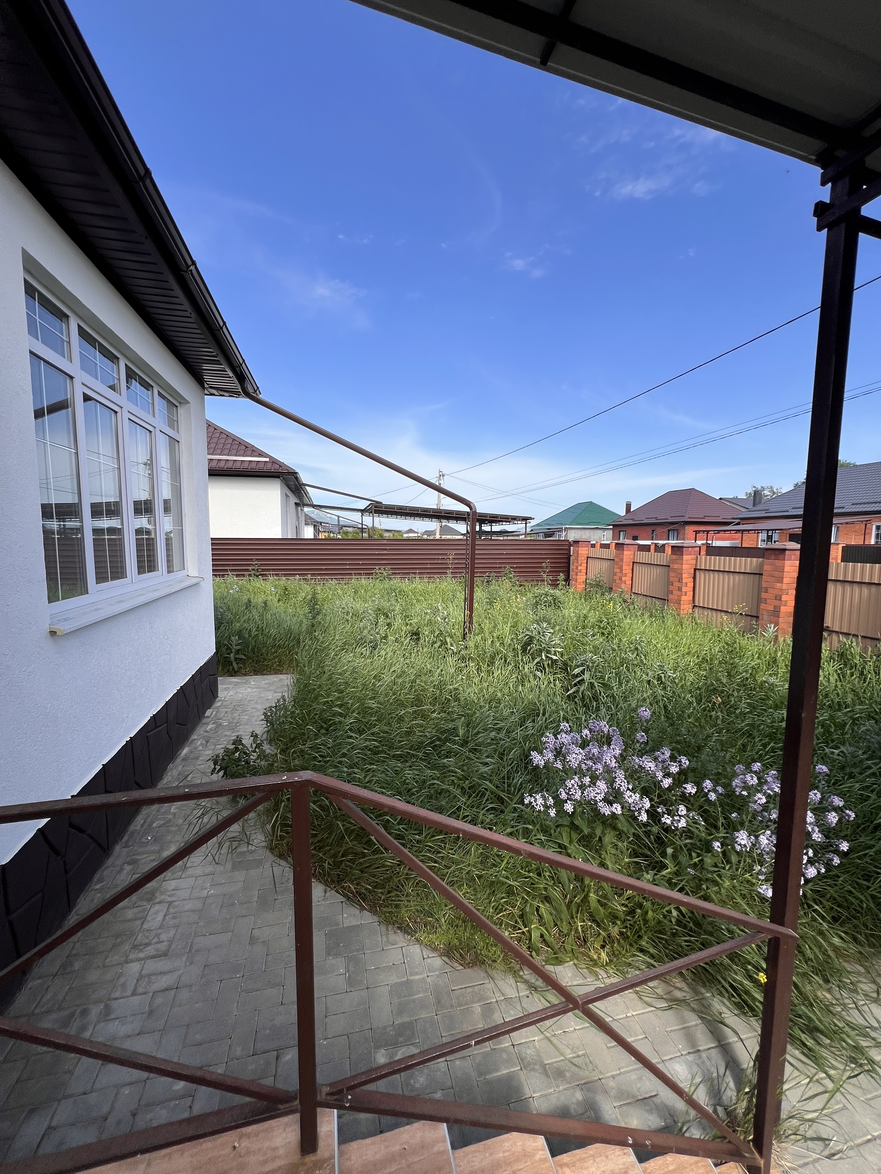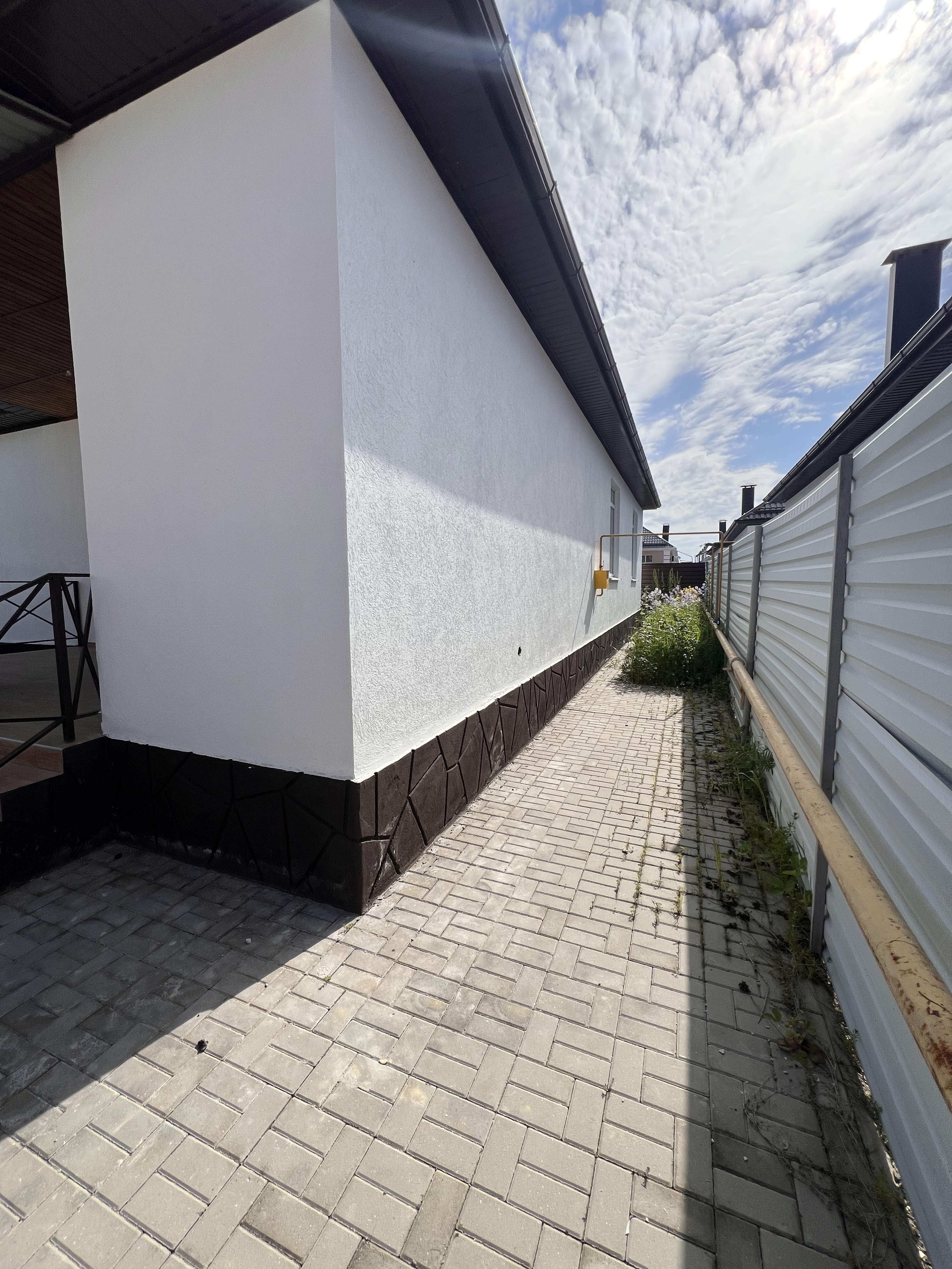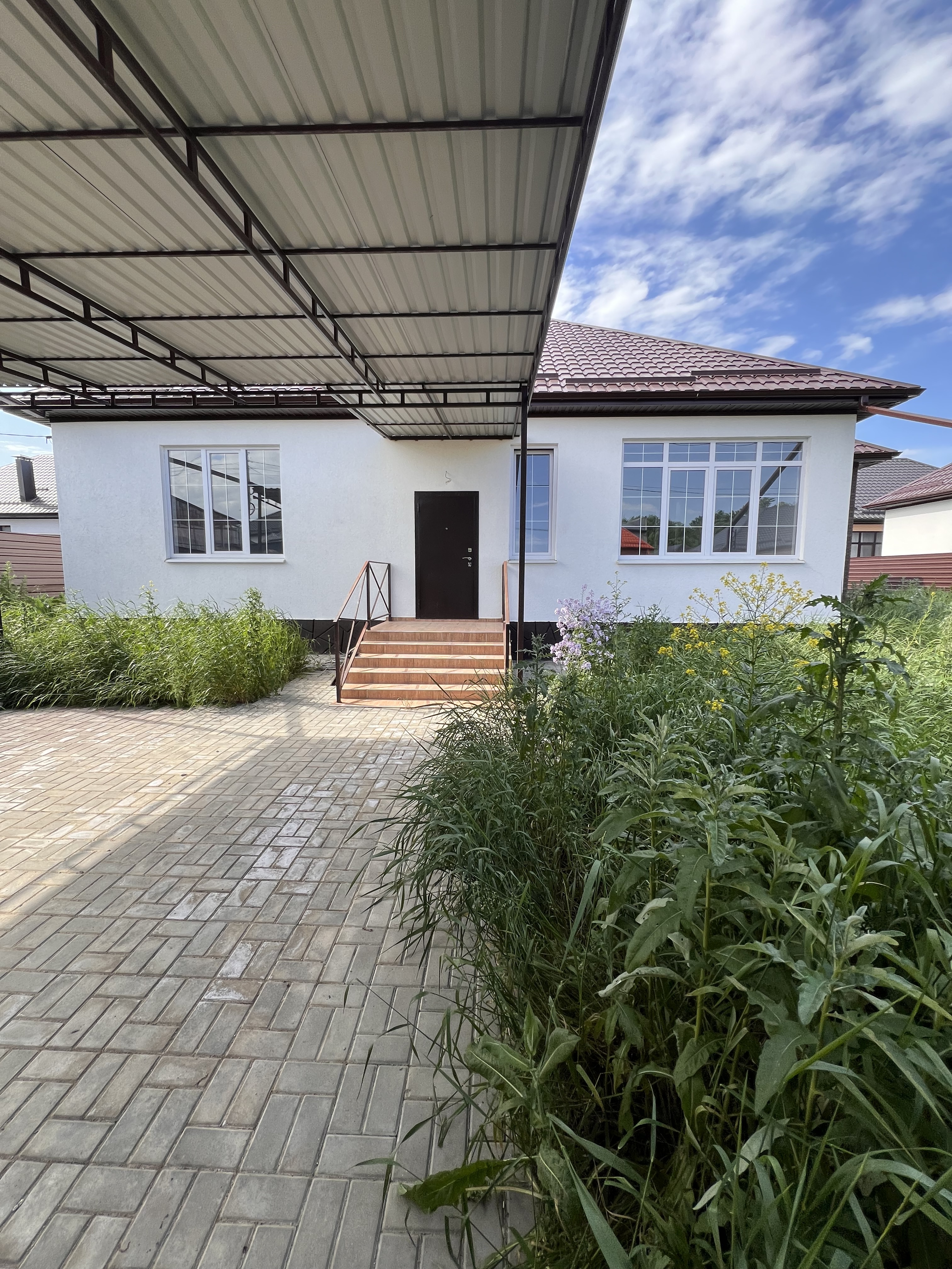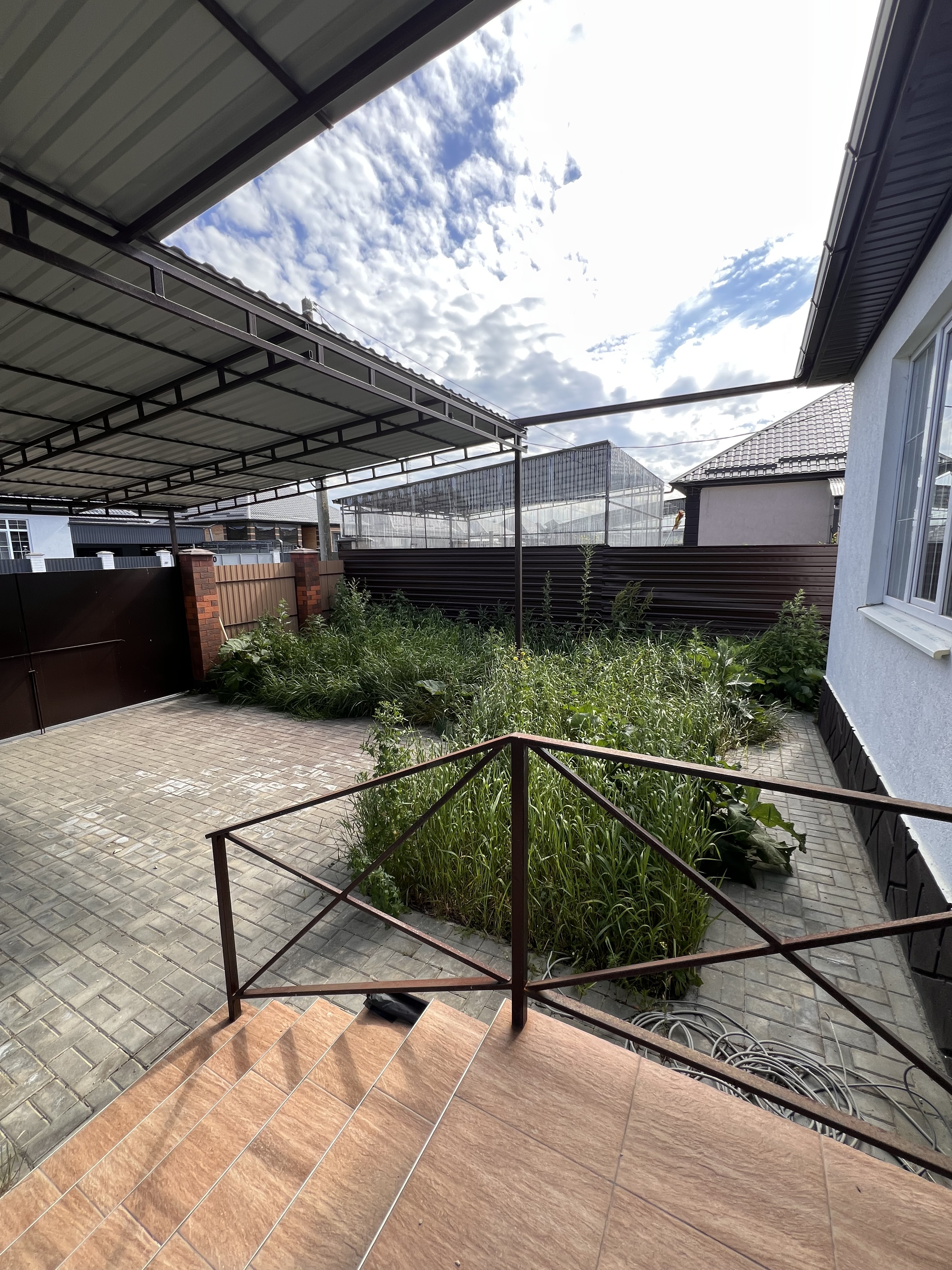 Во дворе дома, облагороженного тротуарной плиткой, навес на несколько машин, кладовая.