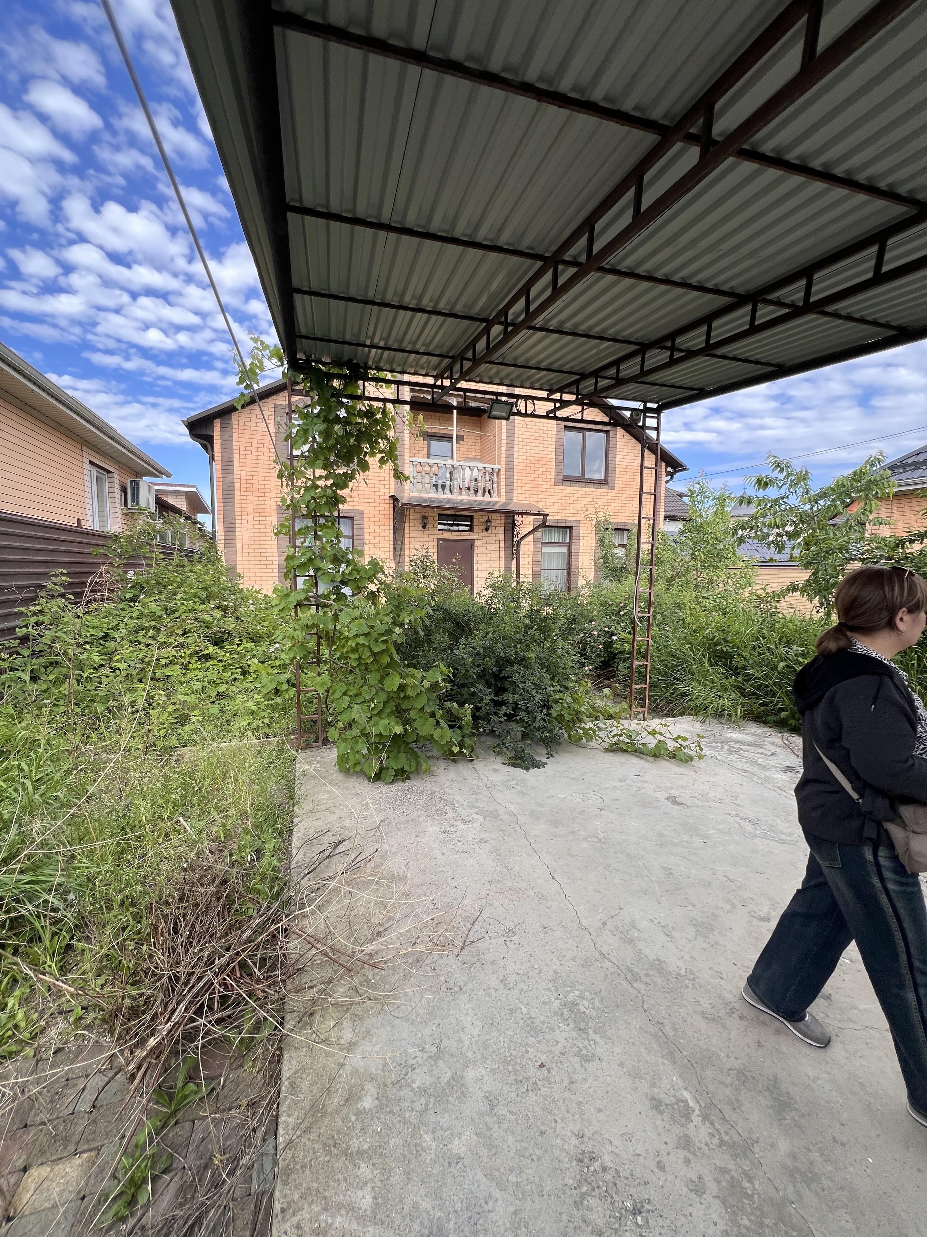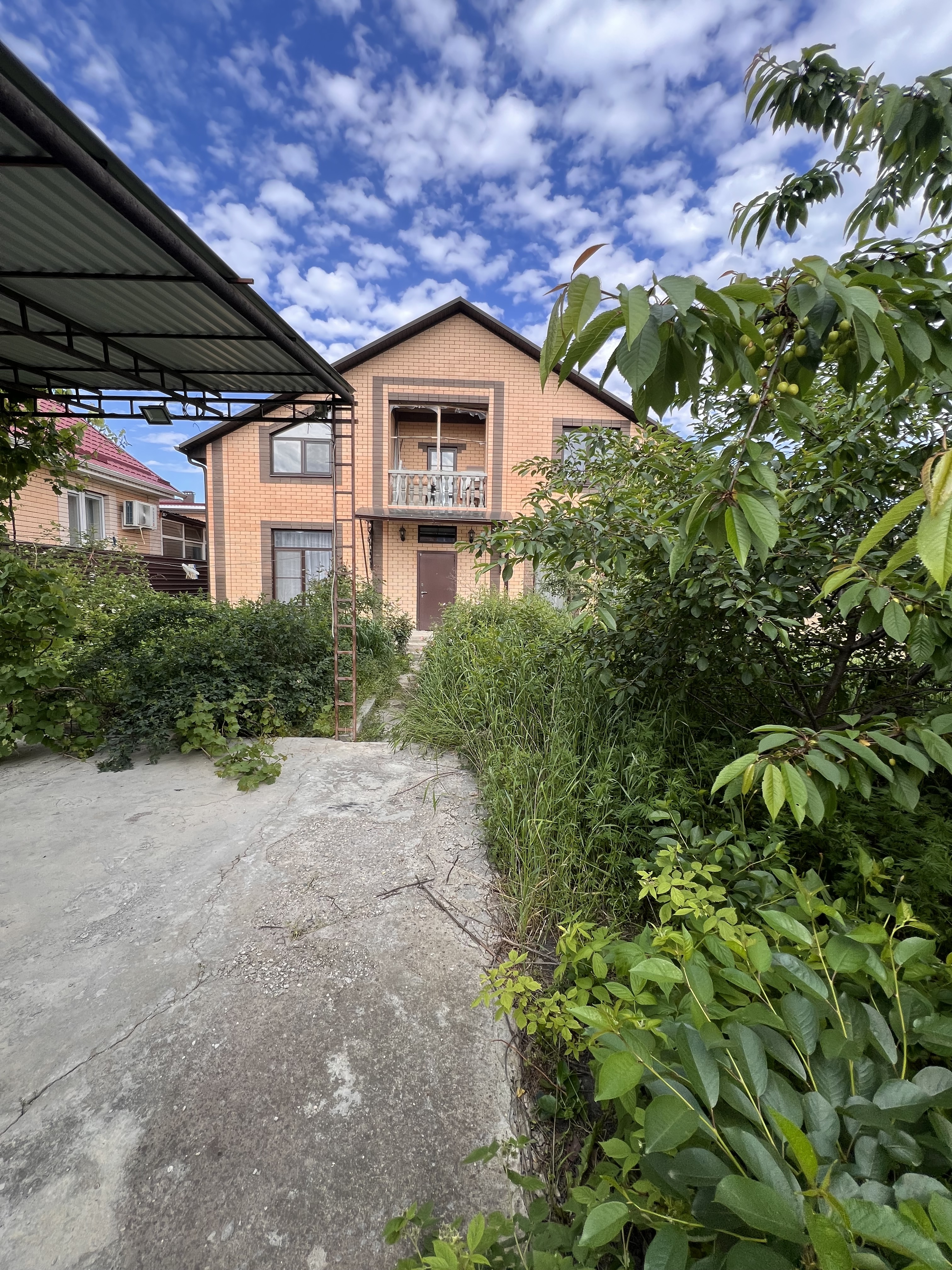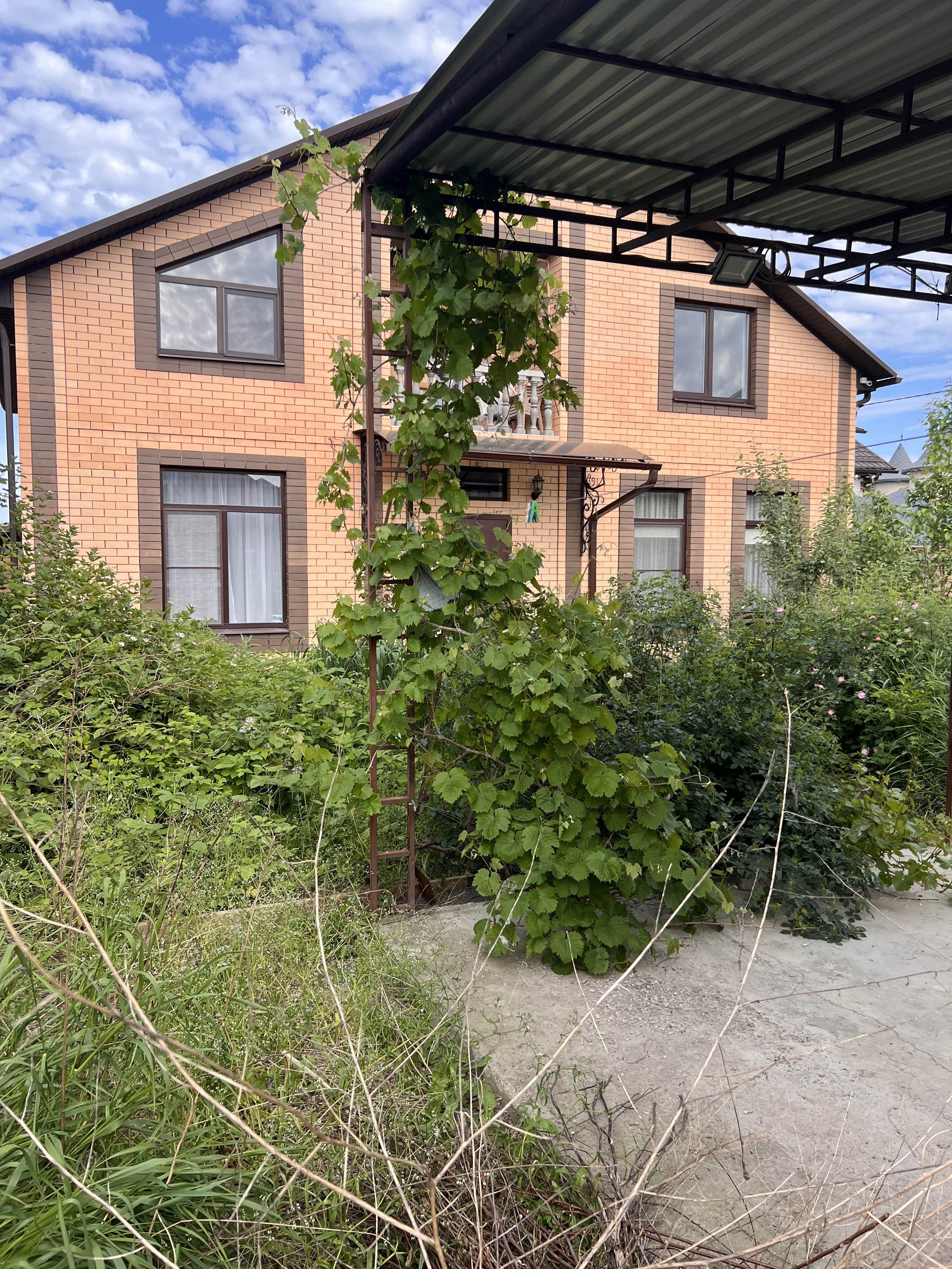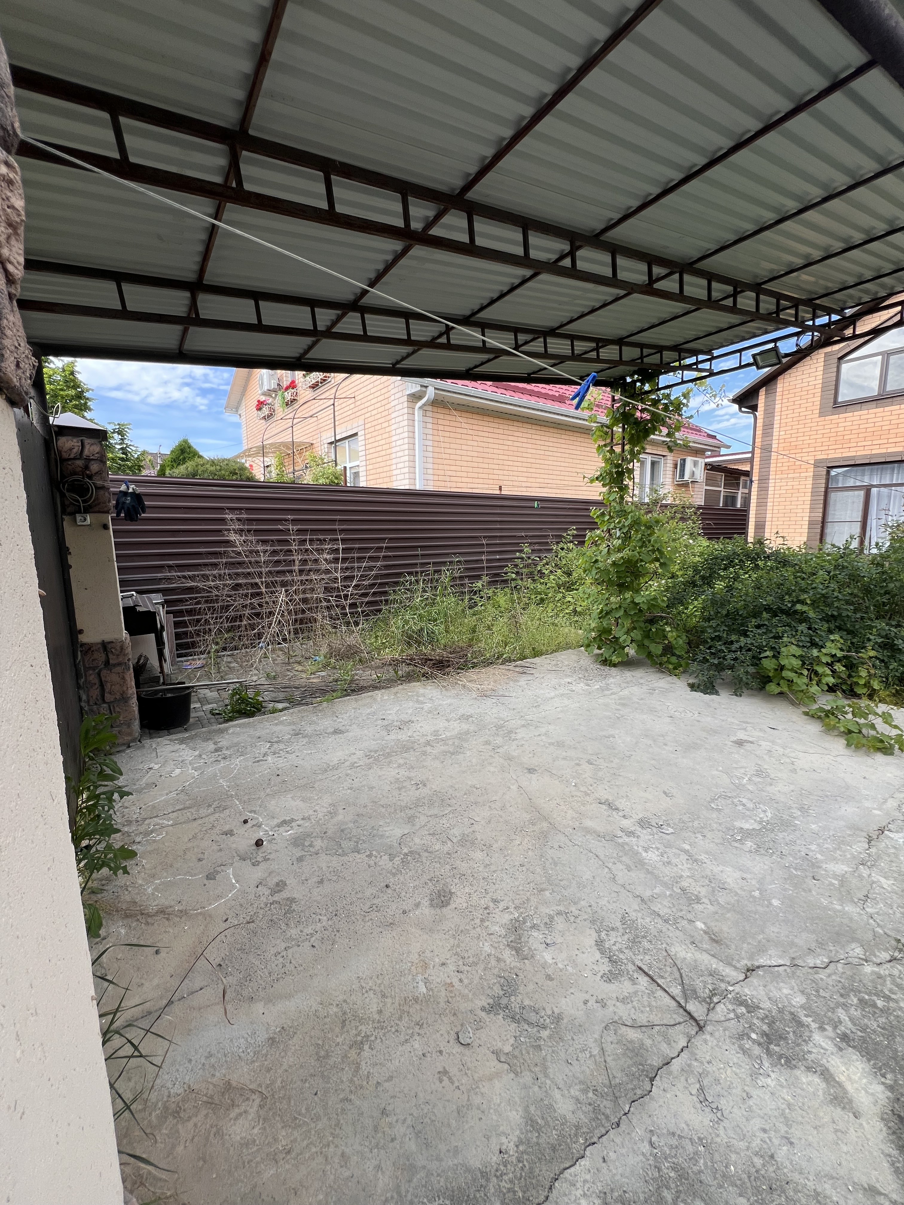 Во дворе дома навес для транспорта, зона барбекю, электрическая разводка под автоматику для ворот и домофон, молодые фруктовые деревья.