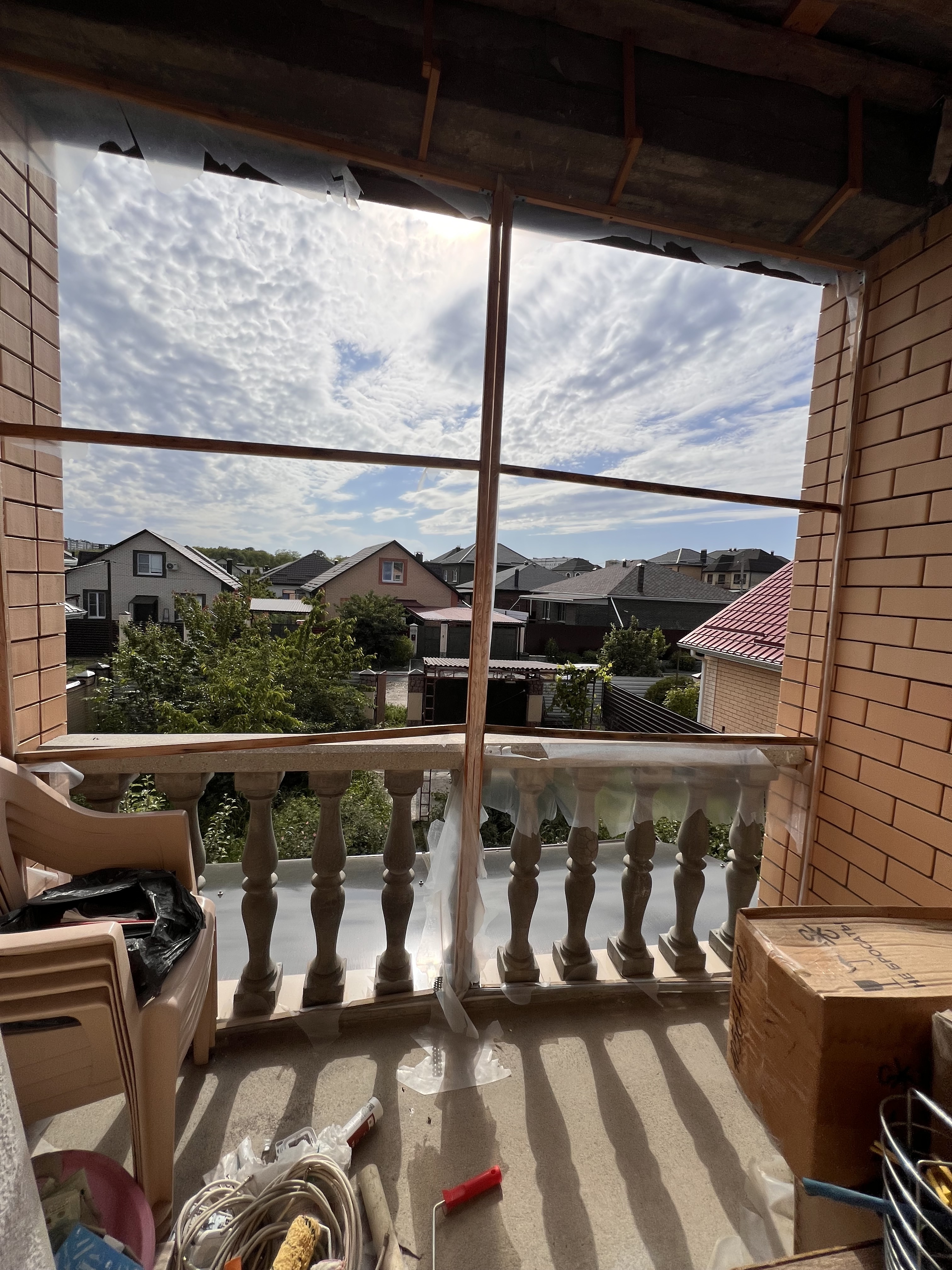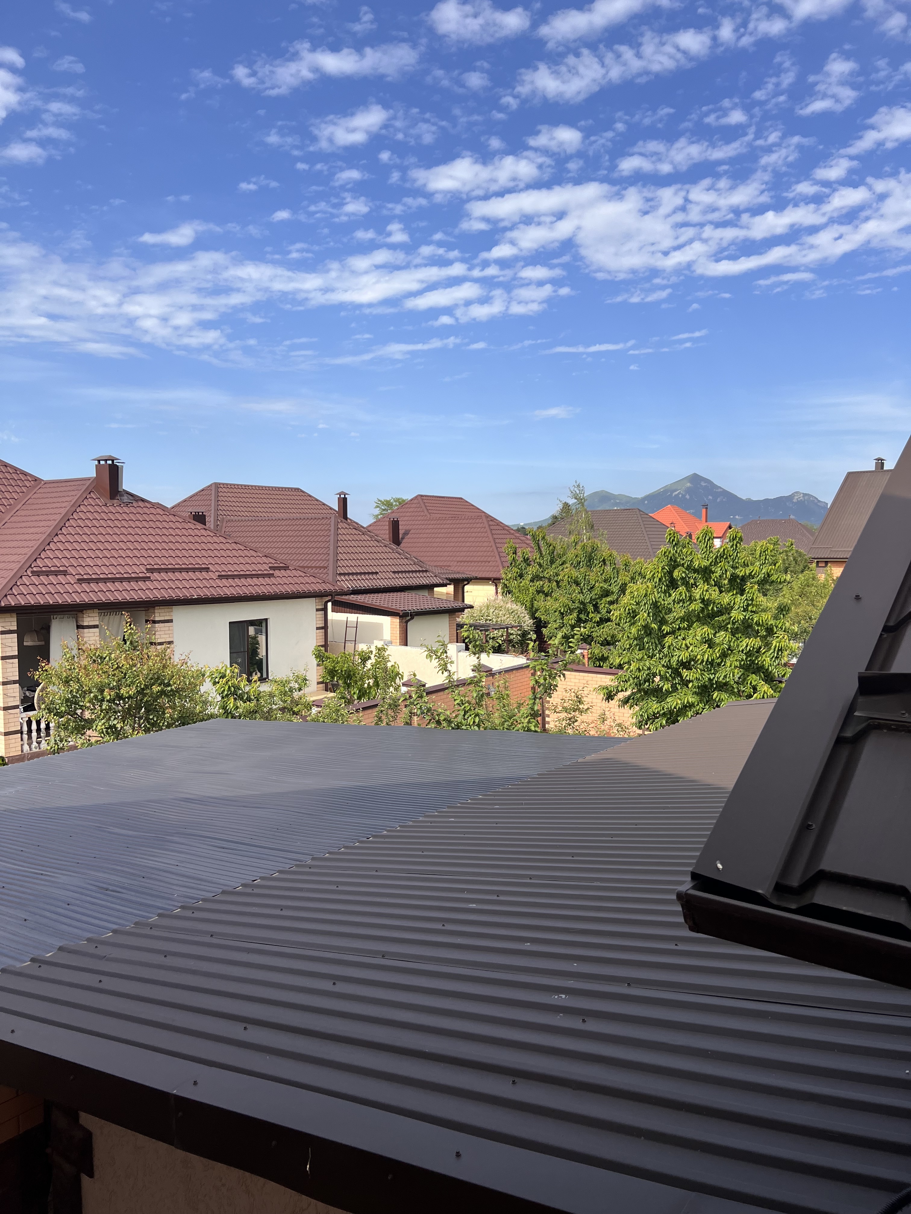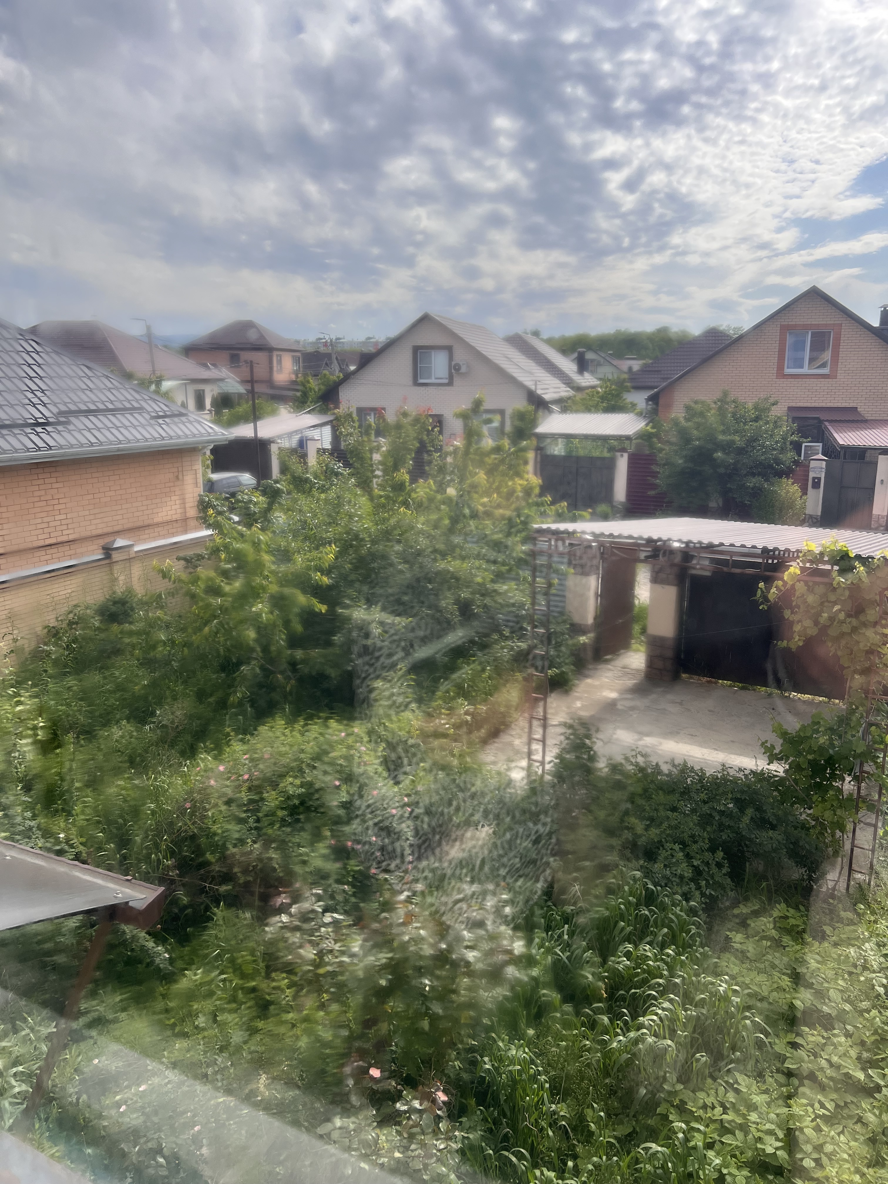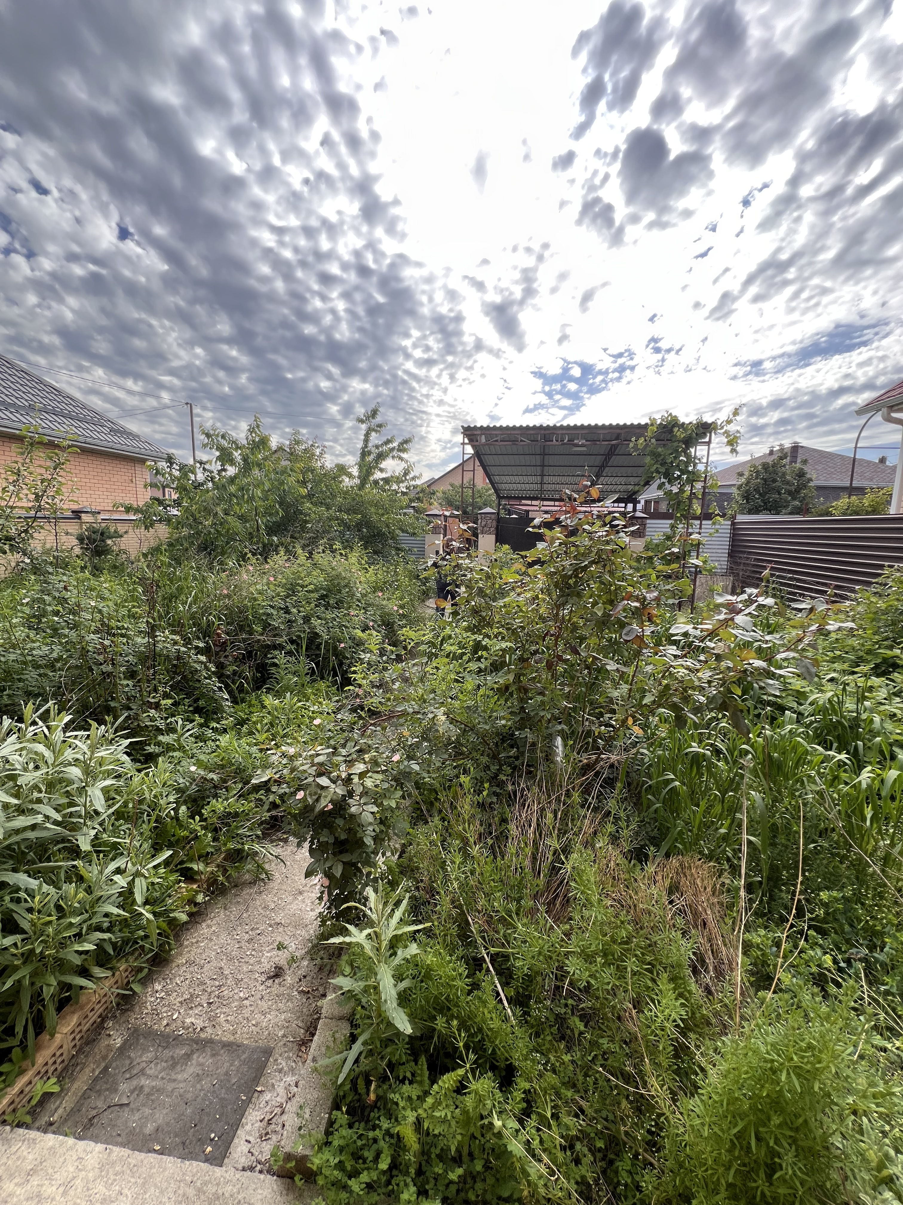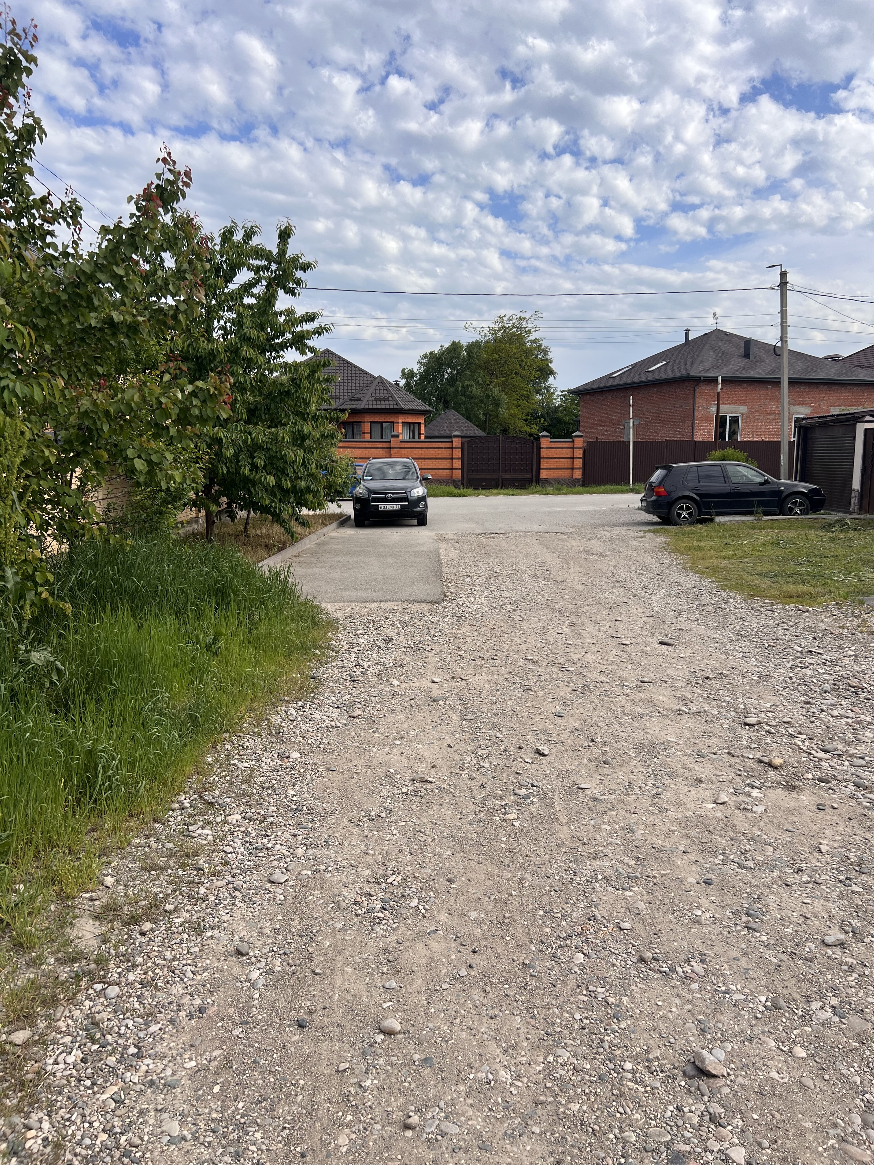 Во дворе дома навес для транспорта, зона барбекю, электрическая разводка под автоматику для ворот и домофон, молодые фруктовые деревья.