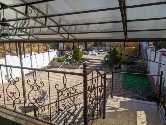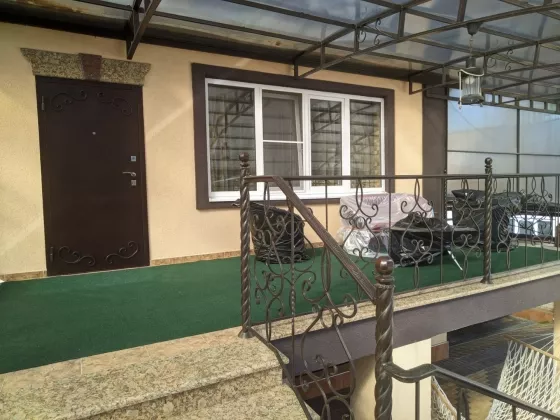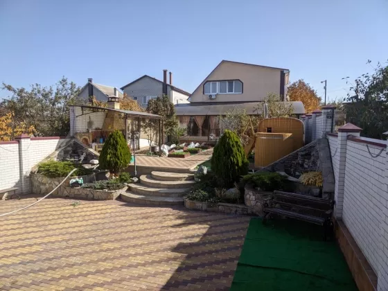 Дополнительно есть вторая кухня . Зона отдыха на террасе и внизу со столом для большой компании. Уютный двор с декоративным водопадом и парковочным местом для двух авто.